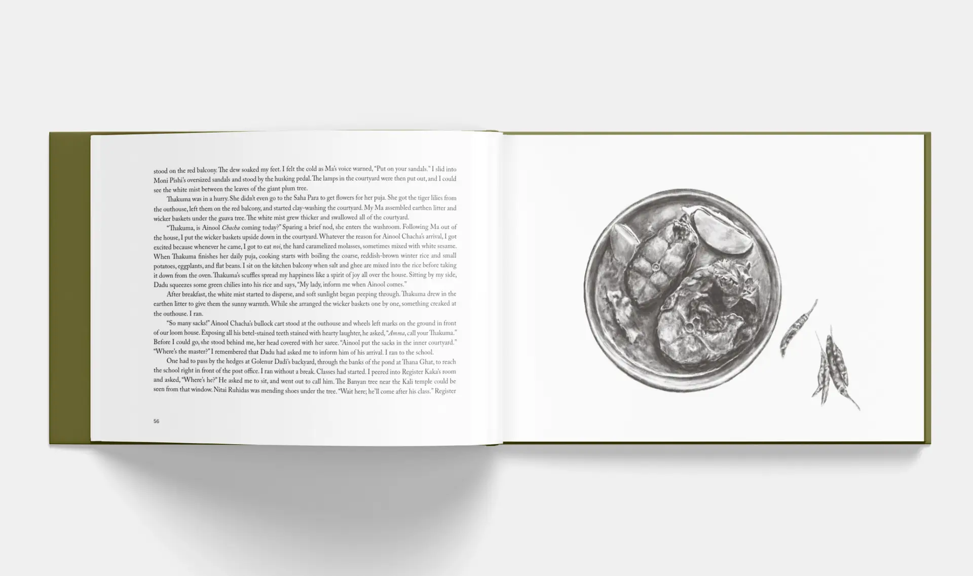The narrative faithfully records the intricate details, that go into cooking in a Bengali household. The bringing of groceries, chopping of vegetables, tempering of spices, to the act of eating and savoring the dishes is depicted. Perhaps, because of the tender relationship between Moni and